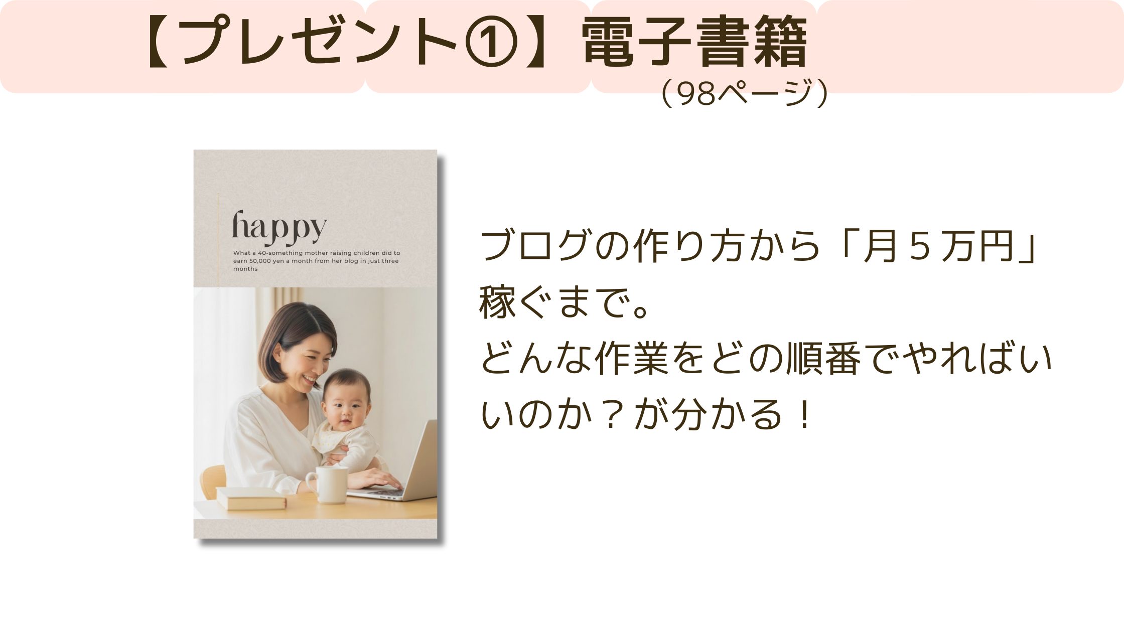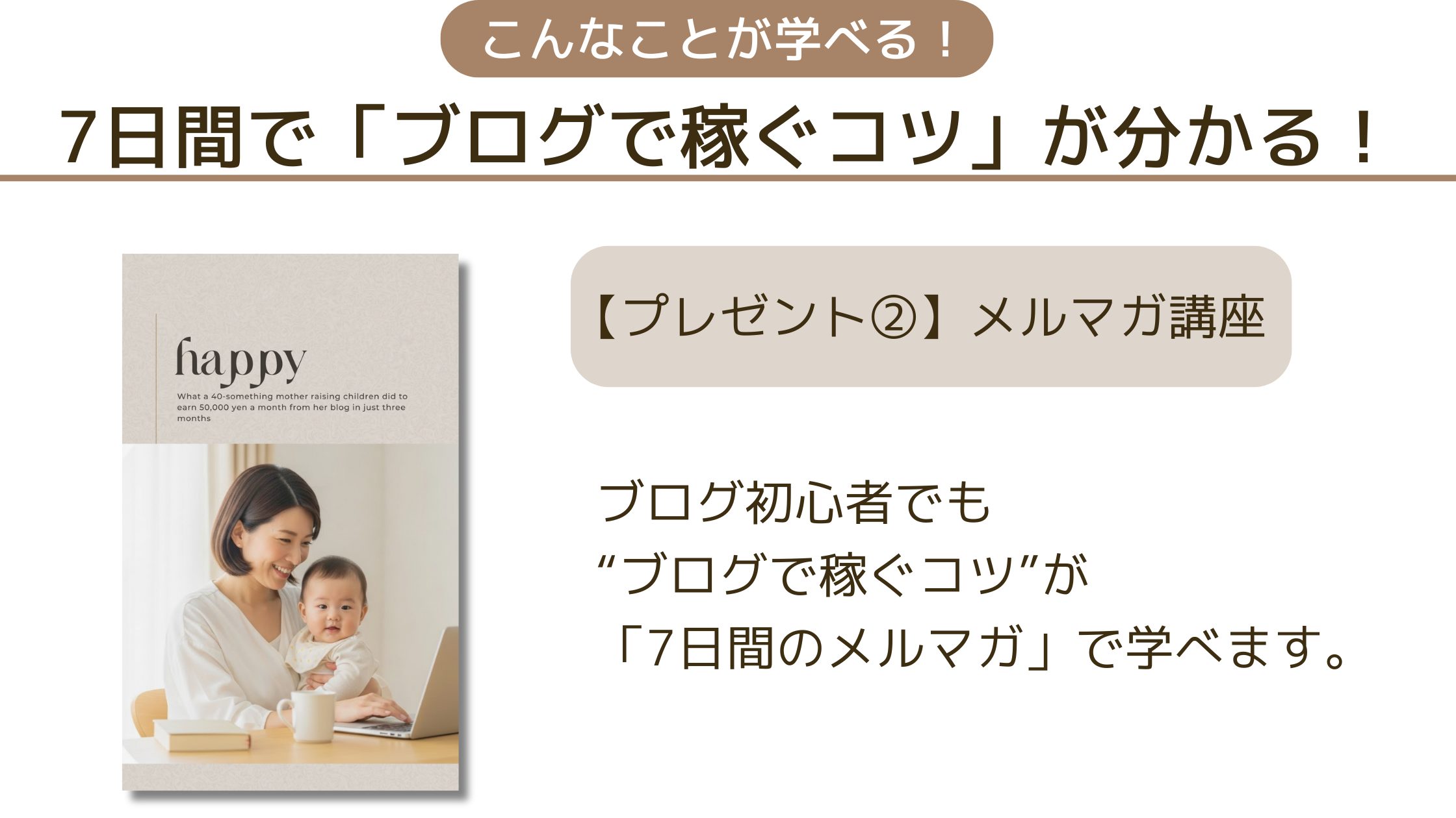 この「プレゼント」に、そのための内容をぎっちり詰め込んだので、ぜひ「副業ブログ」のお手本として使ってくださいね。