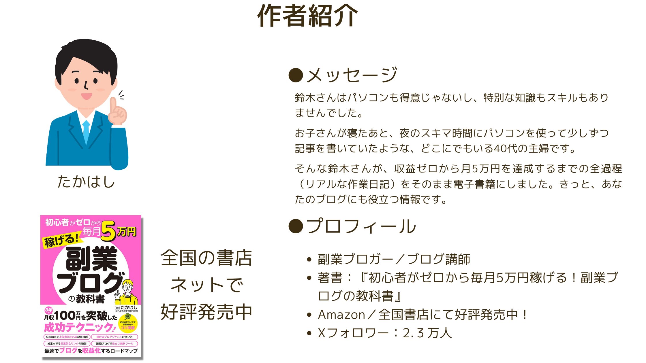 この電子書籍では、実際に私の書籍を購入された「40代主婦の鈴木さん」が、収益ゼロから月5万円を達成するまでの全過程(リアルな作業日記)をそのまま公開しています。